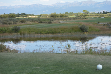 Hole 9’s four tee areas are all surrounded by water. Ducks love this hole and offer an Audubon array of ducks for the early bird golfer (no pun intended). A layup between the 100-yard marker and the fairway bunker leaves a short approach to the green. If the pin is back-left, play to the middle of the green with the approach. The green slopes to front and back from center. Shots hit long may hit the downslope and run into the rough behind the green.